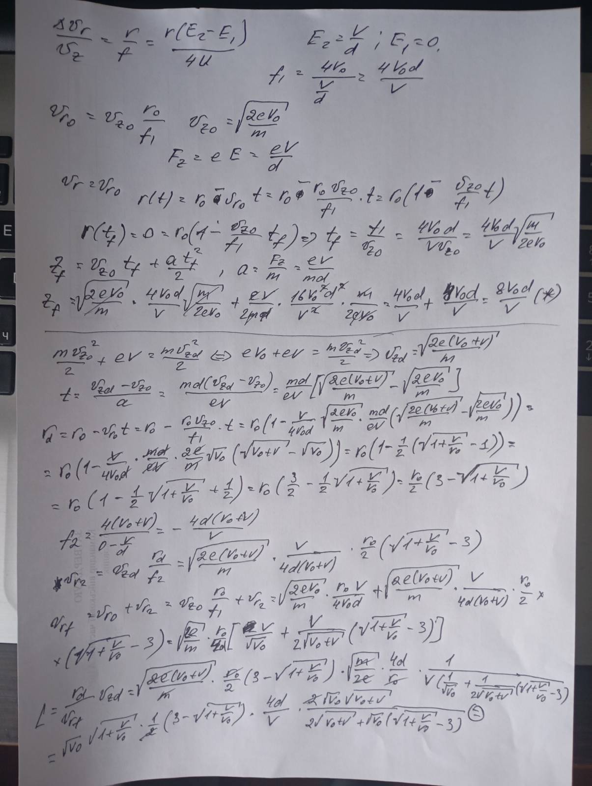 $$t_{п}=\frac{md}{eV}\left( \sqrt{\frac{2e(V_{0}+V)}{m}}-\sqrt{\frac{2eV_{0}}{m}} \right) \tag{8}$$